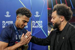 前皇马名宿马塞洛为这位小将颁奖,杜埃双手合十,弯腰向前辈致意,尽显谦逊。
